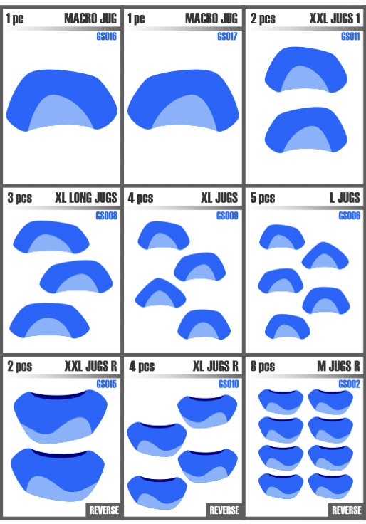 Ergo    M Jugs 337.59 EUR Secret Holds  - Ergo Range - PU - All Texture - 10 Units - Size M - Jugs This is a set of a 10 M size good JUGS. Fresh extension to our flagship ERGO line.  No crimping, ergonomic small jugs....